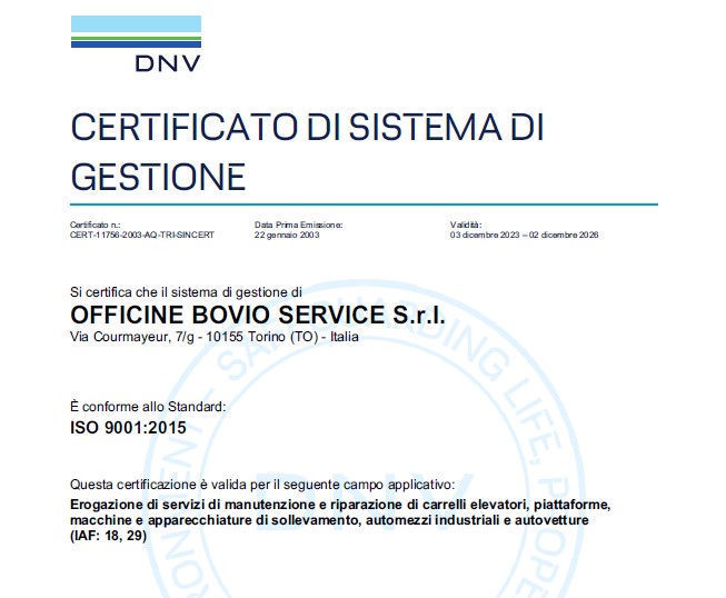 La Officine Bovio Service sono certificate ISO 9001 da oltre 10 anni.